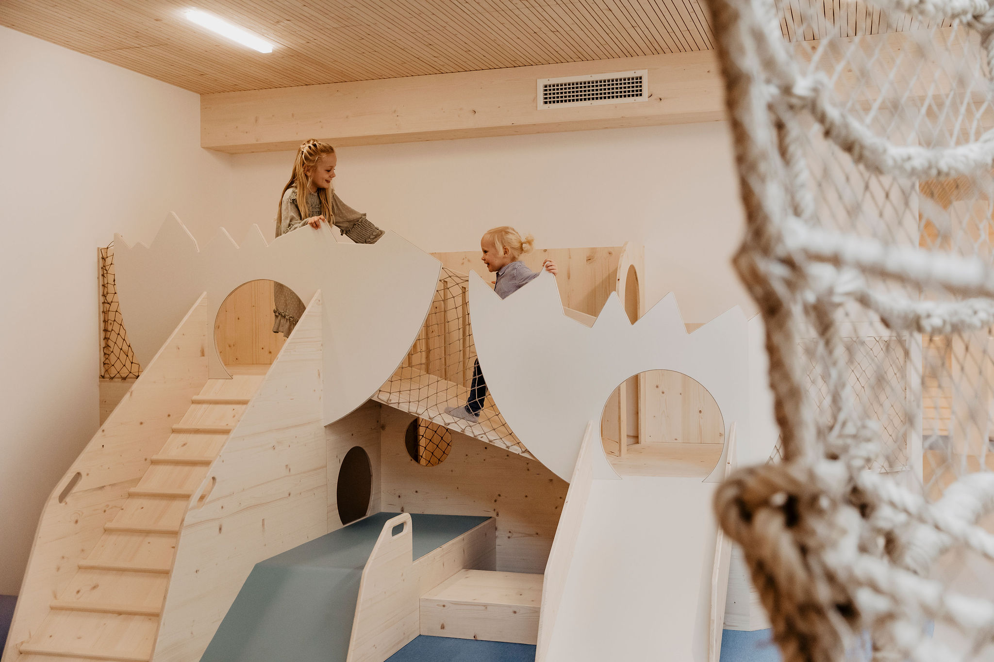 Aufgeteilt auf zwei Stockwerke, dem Luftschloss und dem Erdreich, erleben Familien im Urlaub unvergessliche gemeinsame Momente. Ob beim Klettern, Toben, Springen oder Lesen. Ein abwechslungsreiches Angebot wartet im Eltern-Kind-Bereich auf die Familien.