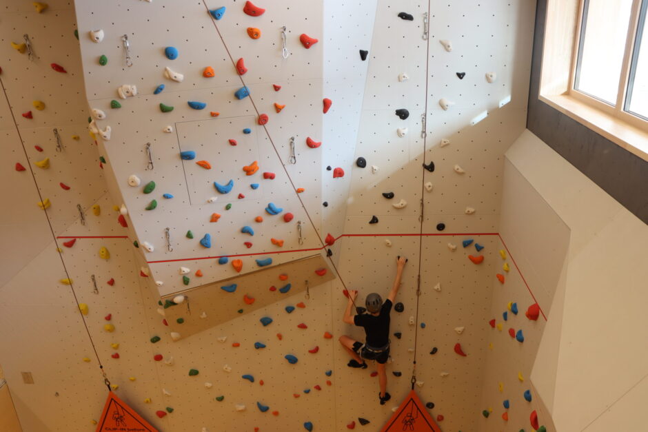 – 8 Meter hohe Kletterwand, teilweise überhängend.