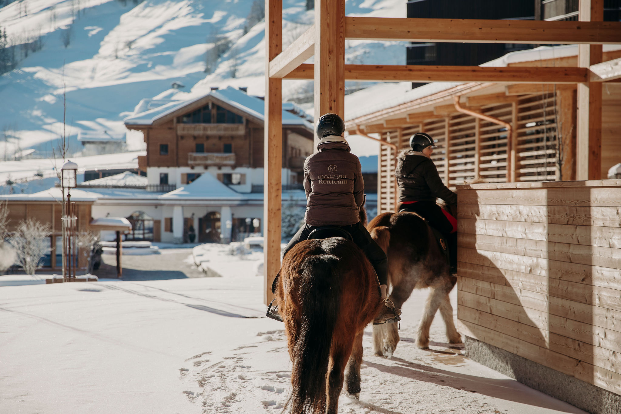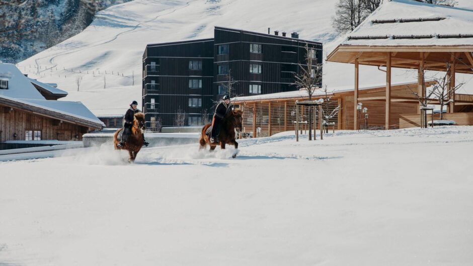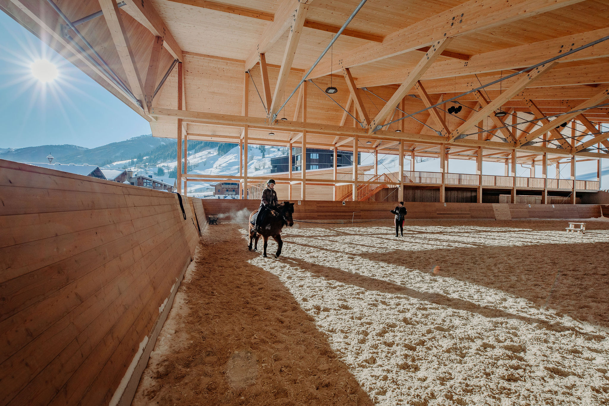 „Die Reithalle fungiert als Abschluss des Hotelareals. Durch die offene Konstruktion ermöglicht sie einen 360 Grad Blickwinkel. Die Besuchergalerie ermöglicht den Blick zum Reiten, zur Langlaufloipe, aber auch zu den anderen Bewegungsflächen wie dem Trampolin und der Sporthalle.“