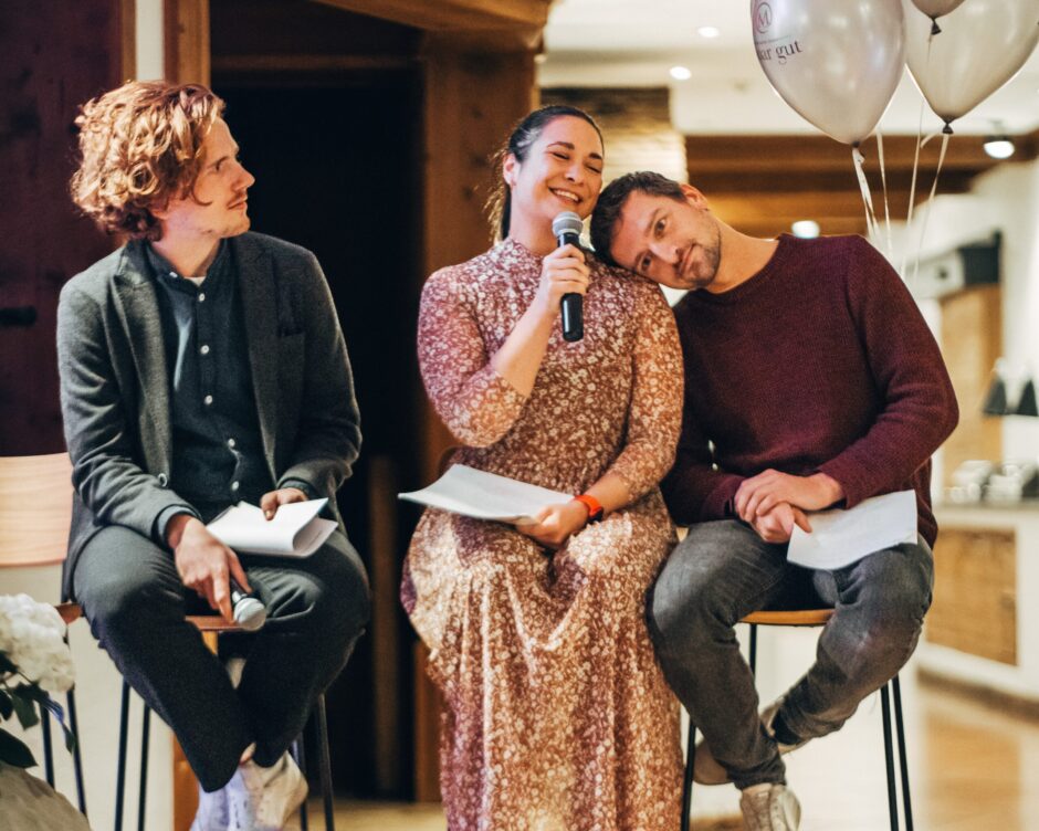 Und dann ging es los. Die Präsentation des neuen Moar Gut Hörspiels. Nach ein paar Worten von Nora Lipp sowie Dominik Walenciak, der Produzent und Eigentümer von Rosekick (www.rosekick.de), wurde den Gästen ein Einblick in die erste Folge des Hörspiels durch die Originalsprecher gewährt. Der Stargast des Abends: Robin Kallenberger, welcher aus der Schule der magischen Tiere bekannt ist. Er gab zwei der zehn neuen Moar Gut Songs zum Besten. Der Titelsong „Wir sind ein Team“ kam nicht nur bei den Kindern im Publikum bestens an.