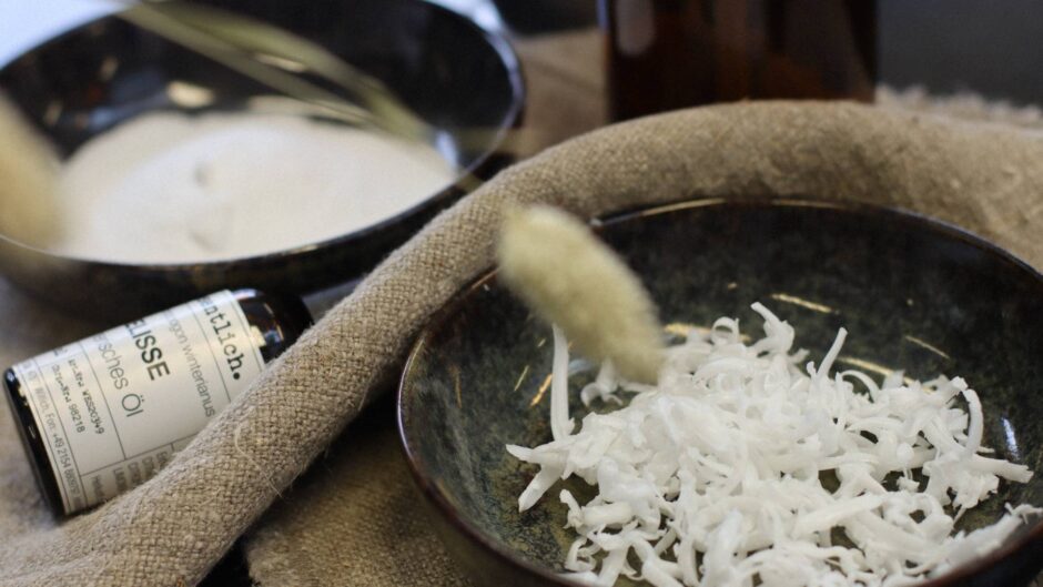 • – optional 10 – 20 Tropfen eines ätherischen Öls für den Duft