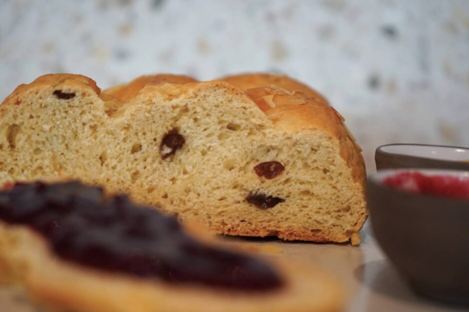 - Osterzopf mit ca. 2 EL Pflanzendrink einstreichen, gehobelte Mandeln darüberstreuen.