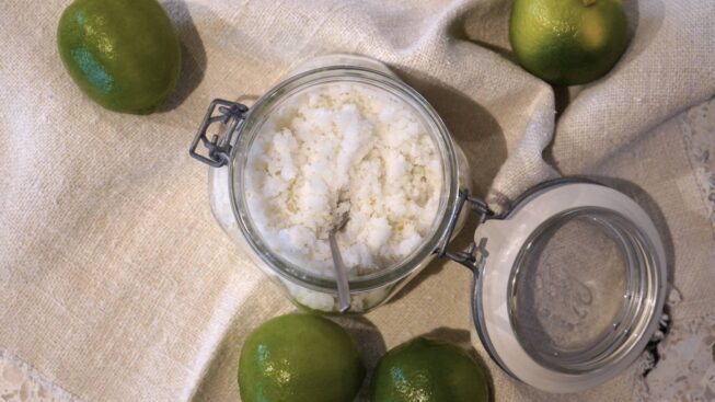 Manchmal braucht unsere Haut einfach eine kleine Auszeit – und was könnte besser sein, als ihr mit einem selbstgemachten Peeling etwas Gutes zu tun? Dieses DIY-Kokos-Limetten-Peeling vereint die pflegenden Eigenschaften von Kokosöl mit der erfrischenden, belebenden Wirkung von Limette. Die feinen Salzkristalle sorgen für ein sanftes Peeling, das abgestorbene Hautschüppchen entfernt, während Kokosöl die Haut intensiv pflegt und geschmeidig macht. Der Hauch von Limette bringt einen frischen Duft, der an Urlaub erinnert. Einfach herzustellen, ganz natürlich und ein echter Verwöhn-Moment – perfekt auch als kleines Geschenk!